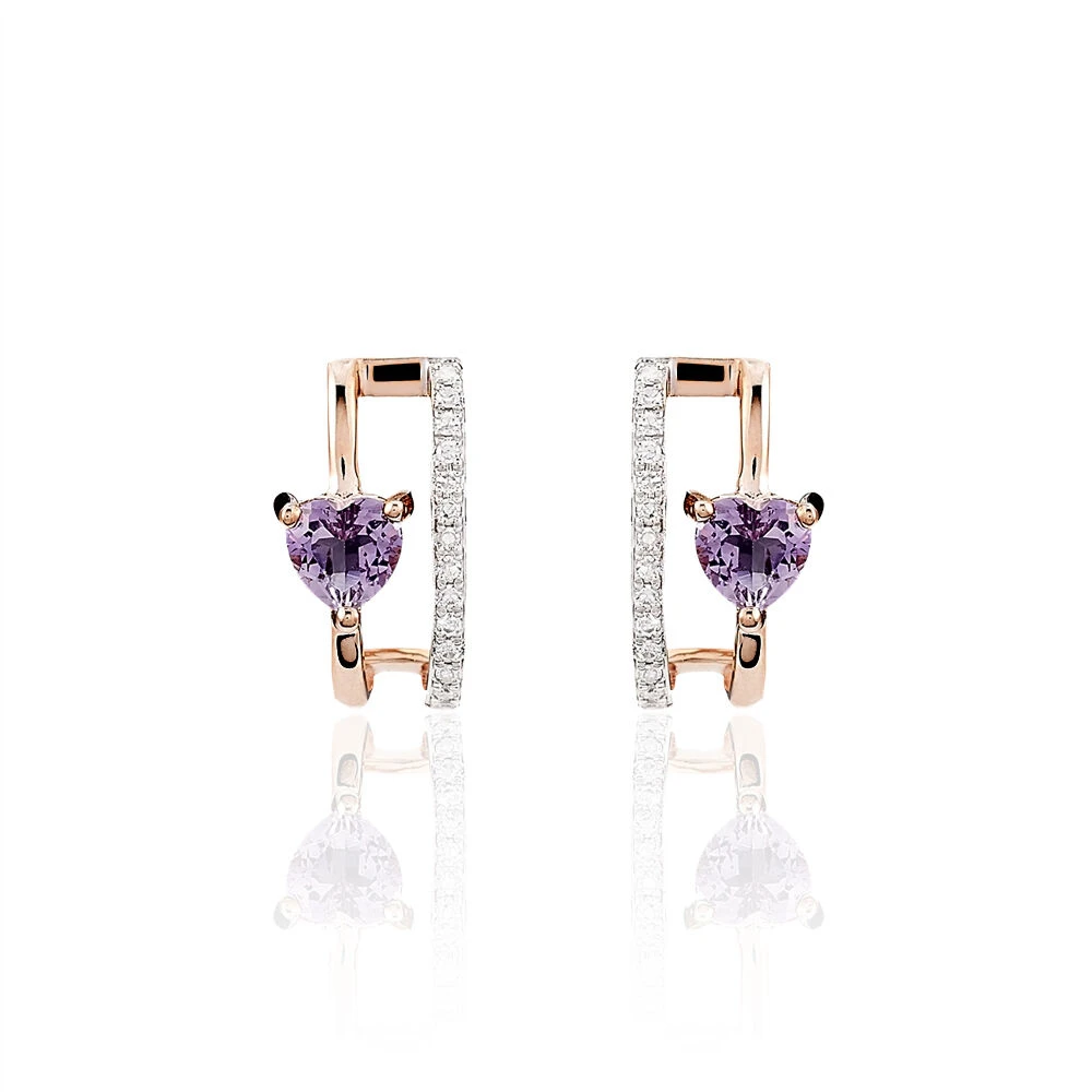 Boucles D’oreilles Puces Or Rose Amethyste Et Diamant