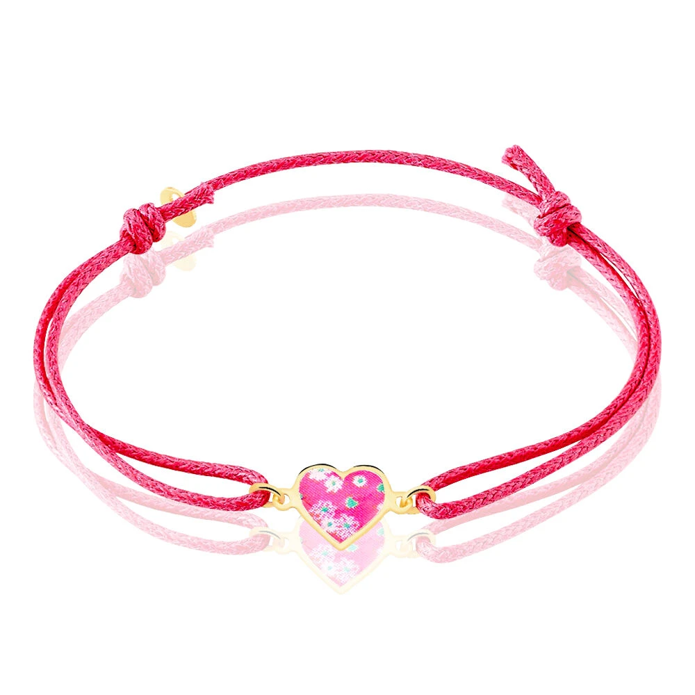 Bracelet Or Jaune 375/1000 Cœur Rose Liberty Cordon Ajustable Fushia
